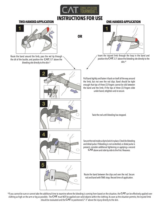 Noted as the best prehospital tourniquet in the February 2008 supplement of The Journal of Trauma The patented C-A-T® is a true one-handed tourniquet proven to be 100% effective by the U.S. Army’s Institute of Surgical Research. Tests proved that the CAT completely occluded blood flow of an extremity in the event of a traumatic wound with significant hemorrhage.The Gen 7 CAT utilizes a durable windlass system with a patented free-moving internal band providing true circumferential pressure to the extremity. Once adequately tightened, bleeding will cease and the windlass is locked into place. A hook and loop windlass retention strap is then applied, securing the windlass to maintain pressure during casualty evacuation. The patented Combat Application Tourniquet® (C-A-T®) featuring the proprietary red tip design and the mechanical advantage of a band within a band has been the Official Tourniquet of the U.S. Army since 2005. The innovations in the CAT are protected by U.S. Patent Nos. 7,842,067 and 7,892,253.
