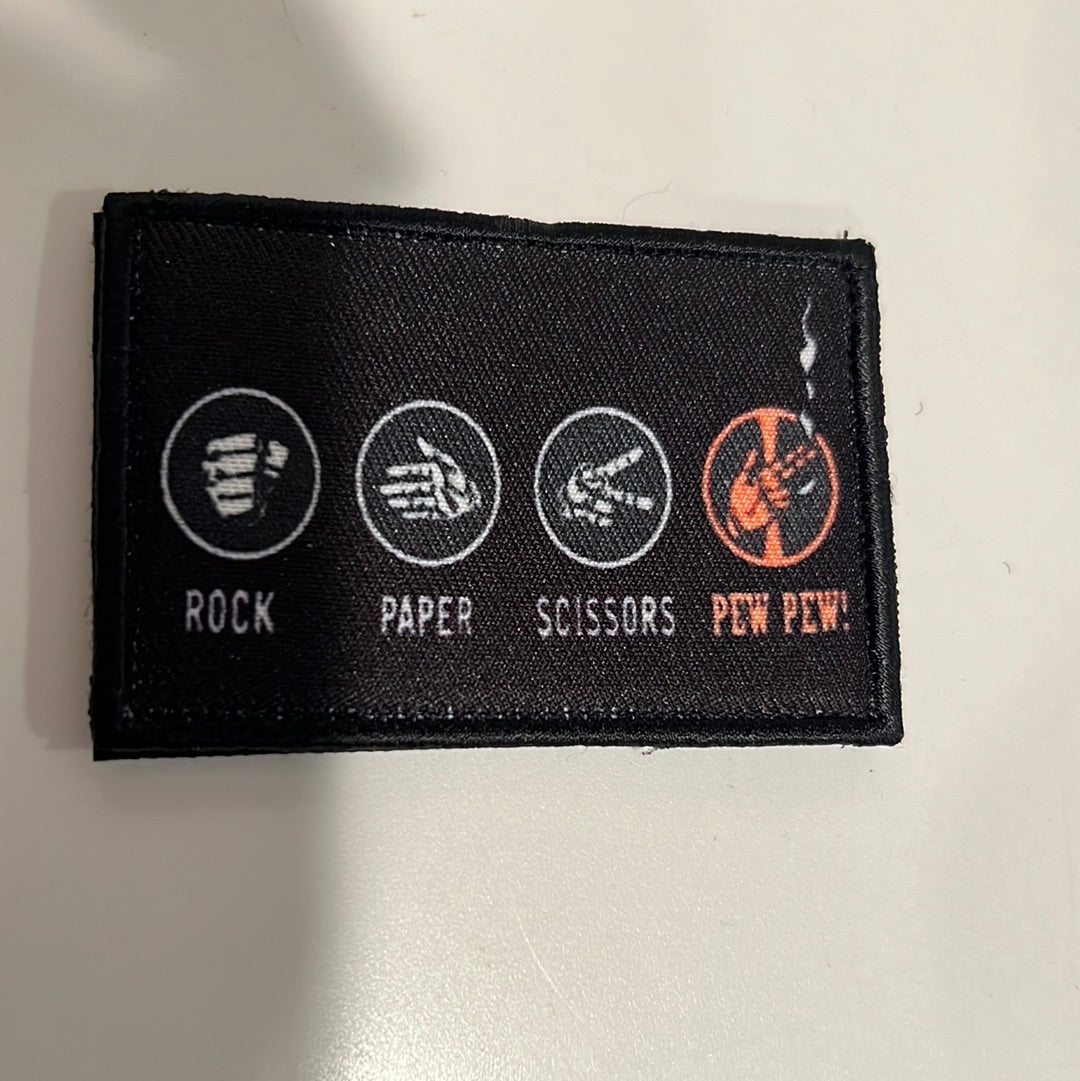 This is for a paper rock scissors patch 2 x 3“ hook and loop on the back to attach it to your gear.