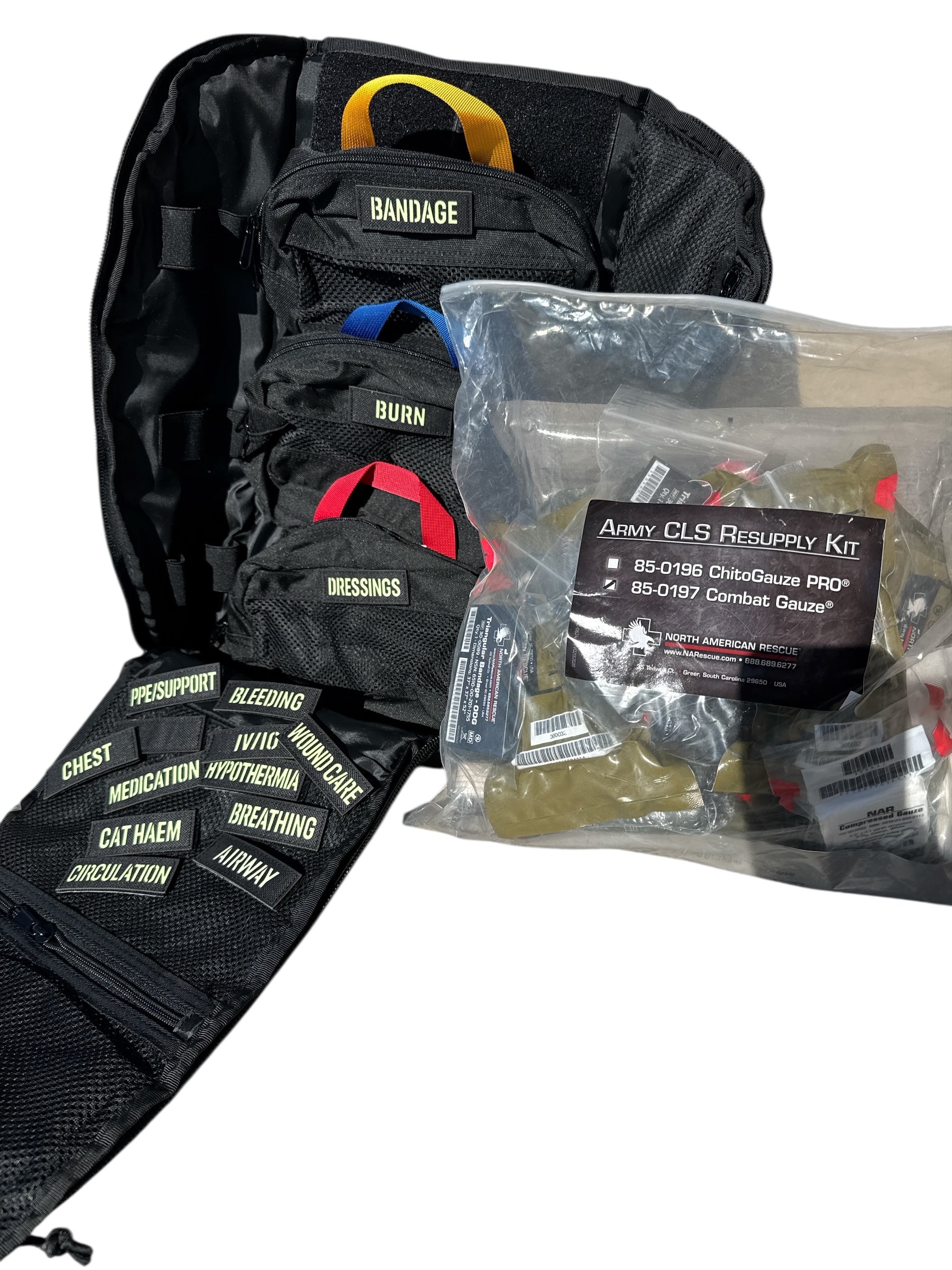 The ARMY Combat Life Saver (CLS) ReSupply Kit by North American Rescue is a convenient kit containing the essential items to resupply your Combat Life Saver compact delivered in a durable and easy-to-open resealable plastic bag.