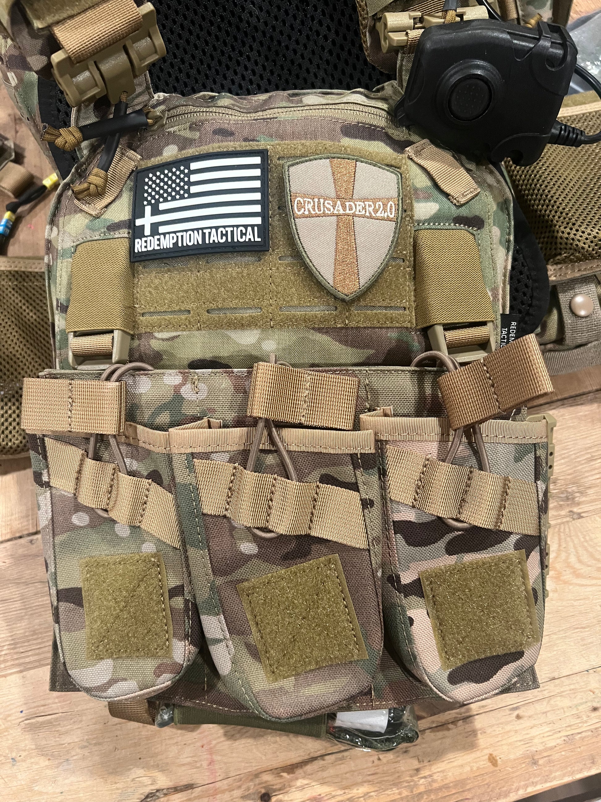 Its made of durable Mil-Spec 1000D Nylon and is very rigid and heavy duty. It also has hook and loop panels in front of each mag pouch to apply additional equipment or your favorite Redemption Tactical patch