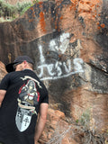 Has our Crusader Glory to God graphic on the back, and the Redemption Tactical logo on the front with our crusader Christian flag on the left sleeve.