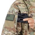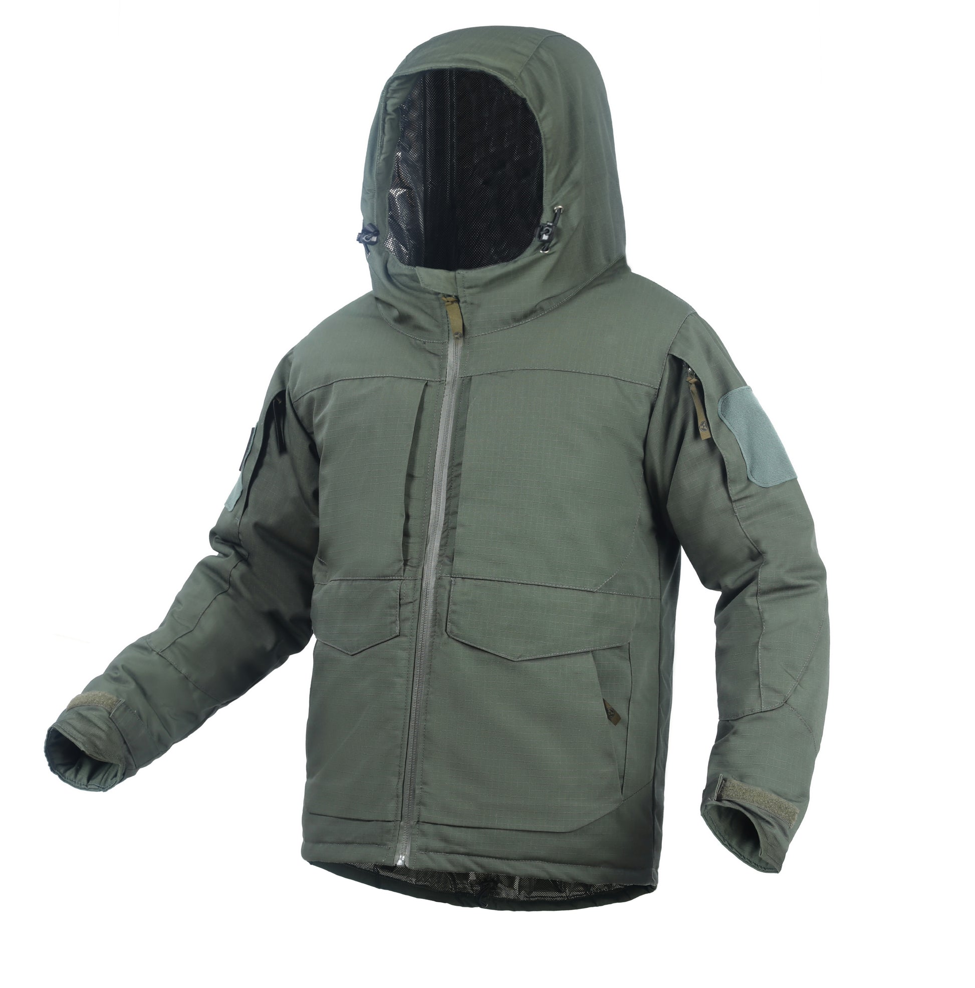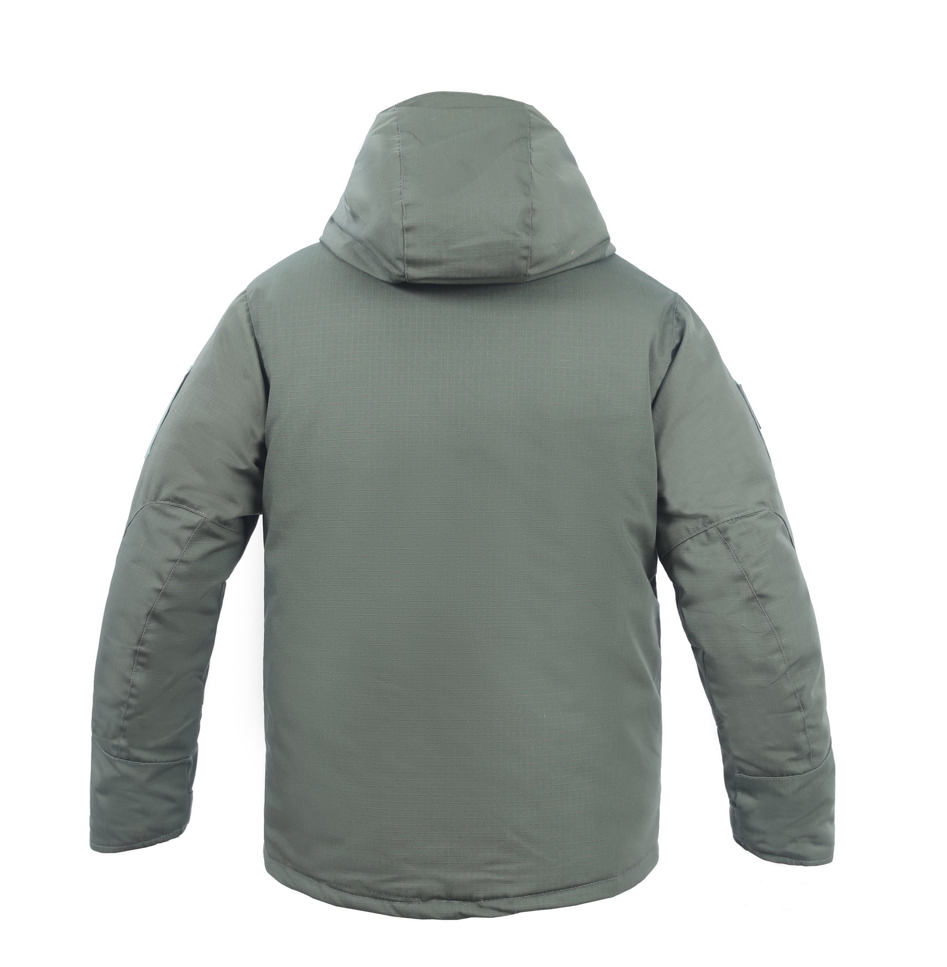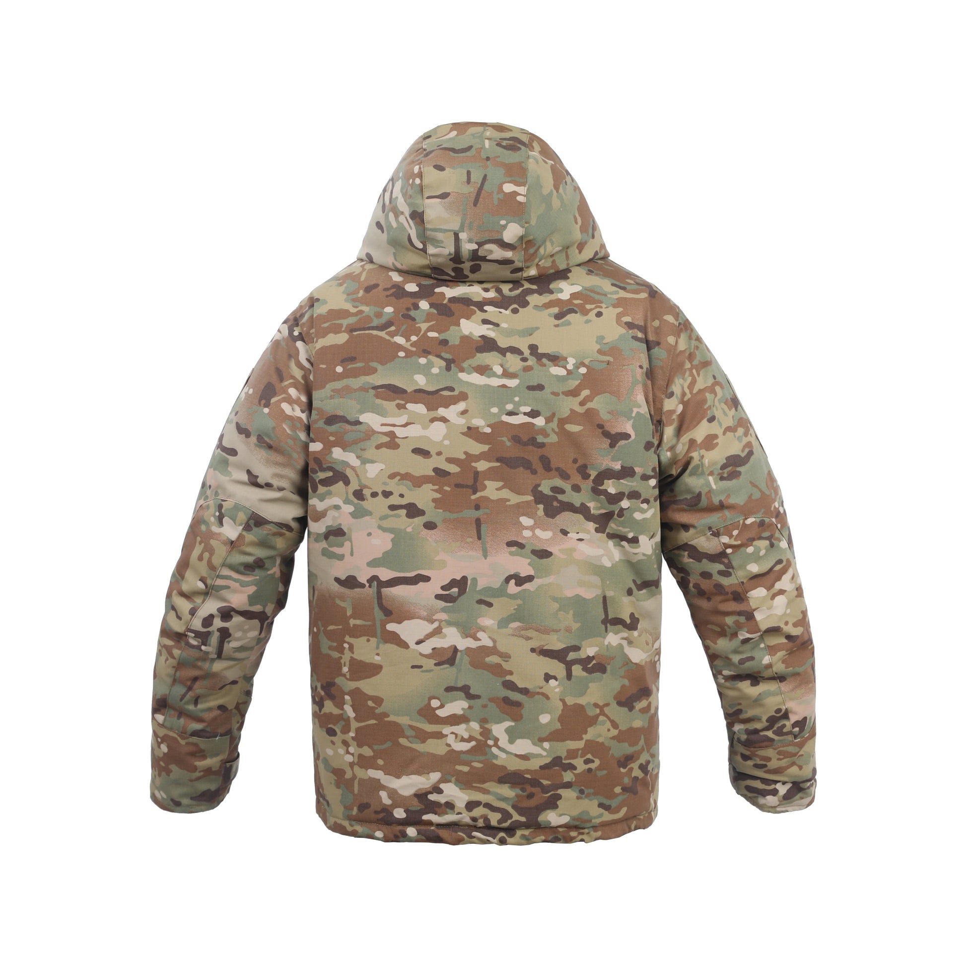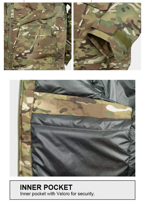 This wind and rain resistant warm quilted jacket has elastic draw strings for the hood, 8 exterior pockets for your gear. 2 can be used for Mag Pouches, 2 for your hands, 2 on the arms and two on the chest and two interior pockets.