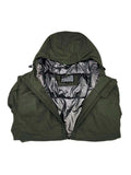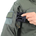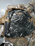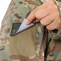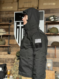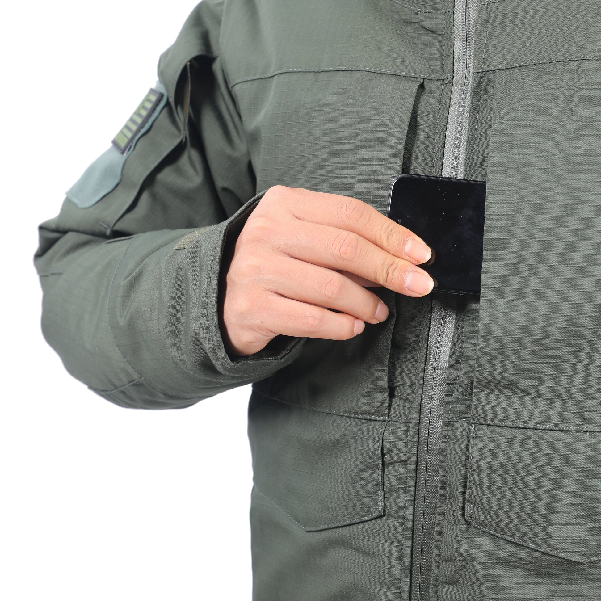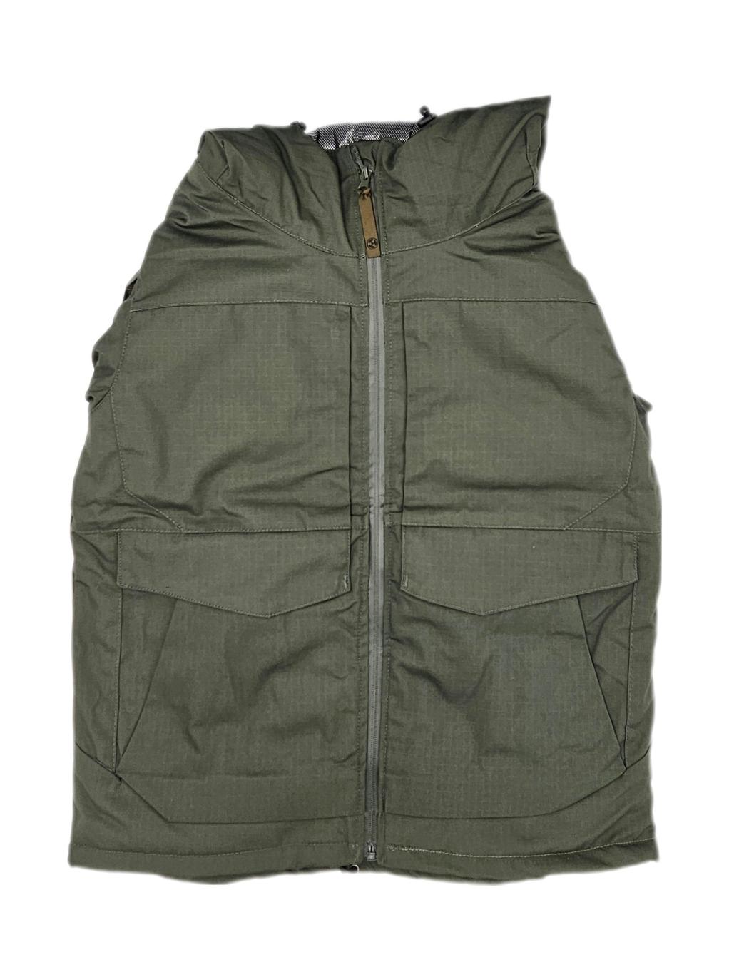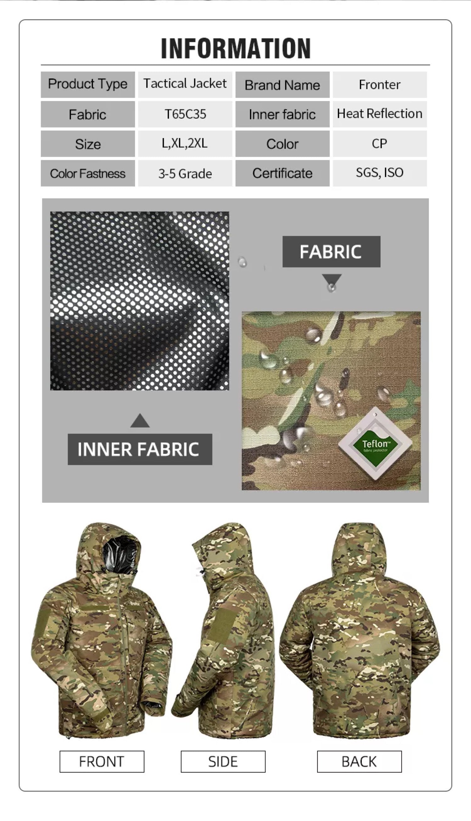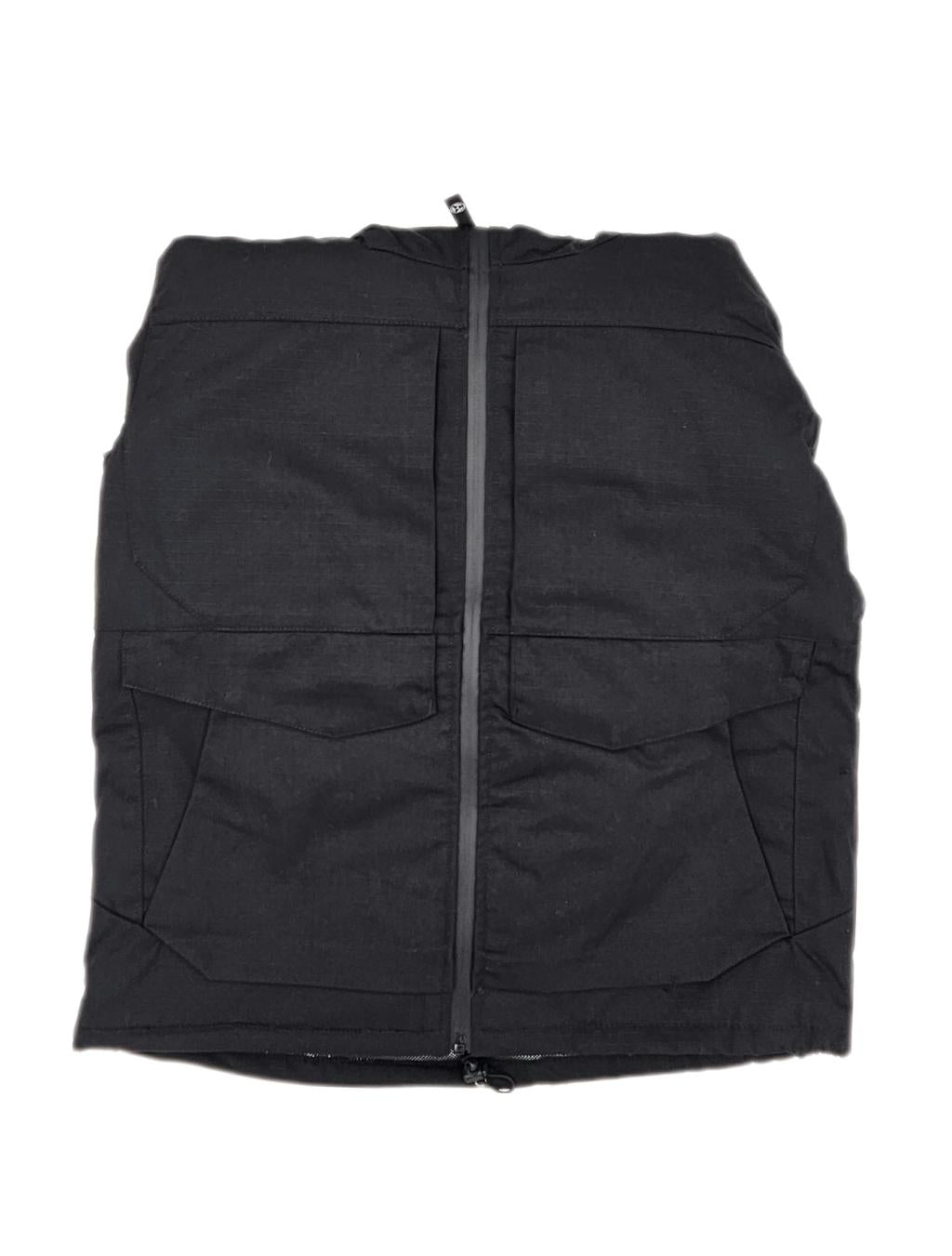 This wind and rain resistant warm quilted jacket has elastic draw strings for the hood, 8 exterior pockets for your gear. 2 can be used for Mag Pouches, 2 for your hands, 2 on the arms and two on the chest and two interior pockets.